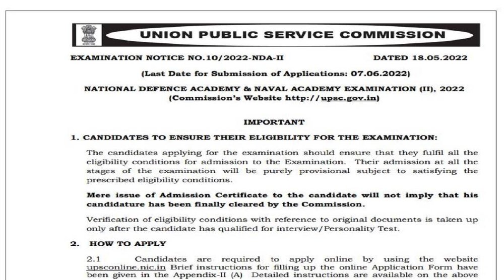 UPSC NDA, NA II Exam 2022: संघ लोक सेवा आयोग (UPSC) ने नेशनल डिफेंस एकेडमी (NDA) और नेवल एकेडमी (NA) एग्जामिनेशन II के लिए योग्य उम्मीदवारों से आवेदन मांगे हैं। उम्मीदवार आयोग की आधिकारिक वेबसाइट upsconline.nic.in के माध्यम से 7 जून 2022 तक ऑनलाइन आवेदन कर सकते हैं। इसके लिए आवेदन प्रक्रिया 18 मई से शुरू की गई है।