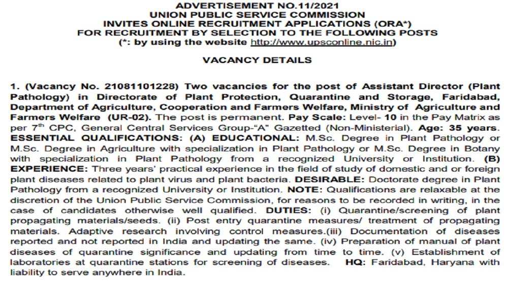 ऑफिशियल नोटिफिकेशन के अनुसार, सहायक निदेशक (प्लांट पैथोलॉजी) के पद के लिए दो रिक्तियां, कृषि और किसान कल्याण मंत्रालय में एग्रीकल्चरल इंजीनियर के पद के लिए एक रिक्ति और असिस्टेंट जियोलॉजिस्ट के पद के लिए 20 रिक्तियां भारतीय भूवैज्ञानिक सर्वेक्षण में रिक्त हैं। रिक्त पदों की पूर्ण जानकारी के लिए उम्मीदवार ऑफिशियल नोटिफिकेशन देखें।
