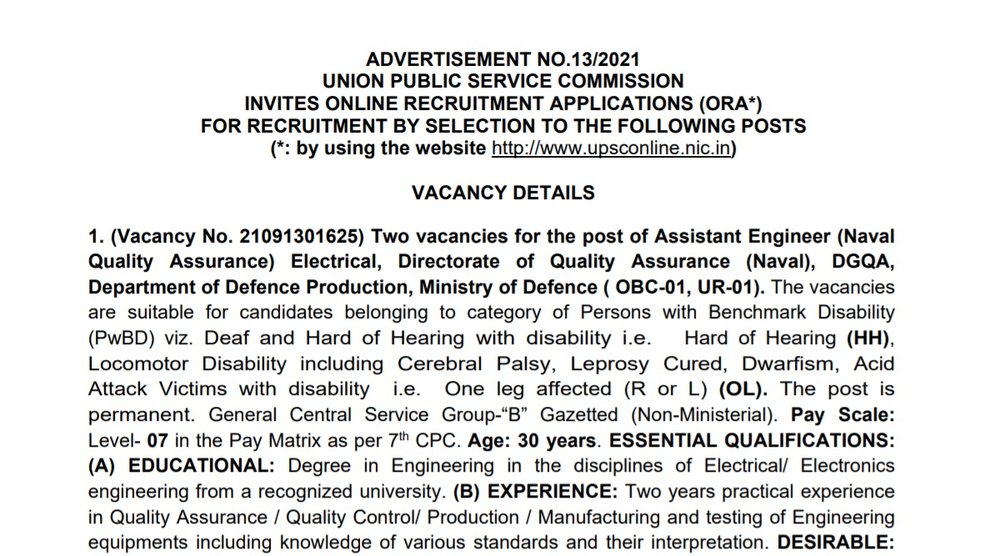 UPSC Recruitment 2021: यूनियन पब्लिक सर्विस कमीशन (UPSC) ने असिस्टेंट डायरेक्टर सहित अन्य पदों पर भर्ती के लिए योग्य उम्मीदवारों से आवेदन मांगे हैं। इच्छुक उम्मीदवार इन पदों पर भर्ती के लिए आयोग की आधिकारिक वेबसाइट upsc.gov.in पर 14 अक्टूबर 2021 तक या उससे पहले आवेदन कर सकते हैं।