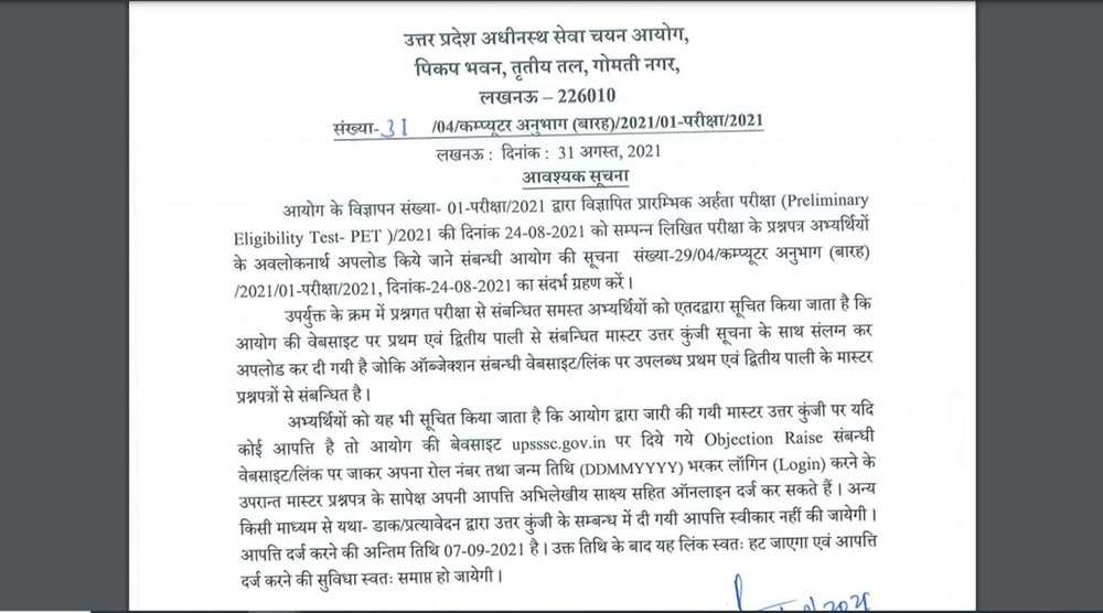 यदि आपको किसी भी उत्तर के संबंध में कोई आपत्ति है तो आप अपने रोल नंबर और जन्म तिथि का उपयोग करके अपने अकाउंट में लॉगिन करके आधिकारिक वेबसाइट पर आपत्ति दर्ज करा सकते हैं। UPSSSC PET आंसर की पर आपत्ति दर्ज कराने की आखिरी तारीख 07 सितंबर 2021 है।
