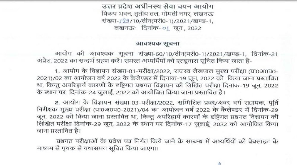 जारी नोटिस अनुसार राजस्व लेखपाल मुख्य परीक्षा का आयोजन अब 24 जुलाई 2022 को किया जाएगा, पहले इस परीक्षा का आयोजन 19 जून 2022 को किया था। वहीं सम्मिलित प्रवर अवर वर्ग सहायक, पूर्ति निरीक्षक भर्ती मुख्य परीक्षा अब 17 जुलाई 2022 को आयोजित की जाएगी। इससे पहले इस परीक्षा का आयोजन 29 जून 2022 को किया जाना था।