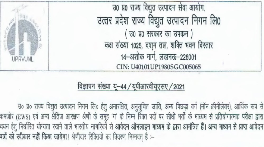 UPRVUNL Recruitment 2022: उत्तर प्रदेश राज्य विद्युत उत्पादन निगम लिमिटेड (UPRVUNL) ने जूनियर इंजीनियर (ट्रेनी), असिस्टेंट अकाउंटेंट, केमिस्ट जीआर- II और लैब असिस्टेंट के पद पर भर्ती के लिए एक अधिसूचना जारी की है। आवश्यक योग्यता और अनुभव रखने वाले उम्मीदवार 28 जनवरी 2022 से इन पदों पर आवेदन कर सकते हैं।