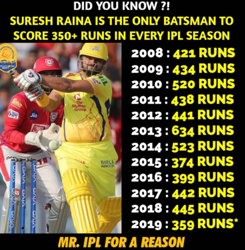 आईपीएल में रैना के बल्ले से सबसे अधिक रन साल 2013 में आए थे, इस साल रैना ने 634 रन बनाने का कारनामा किया था। रैना का यह फॉर्म साल 2014 में भी उनके साथ रहा और इस साल रैना के बल्ले से 523 रन निकले। सुरेश रैना इस सीजन भी चेन्नई के लिए कारगार साबित हो सकते हैं। चेन्नई को मंगलवार को मुंबई के खिलाफ पहला क्वॉलिफायर खेलना है, टीम की कोशिश मुंबई को हरा फाइनल में जगह बनाने की होगी। चेन्नई के लिए अच्छी बात यह है कि यह मुकाबला उन्हें अपने होमग्राउंड चेन्नई में खेलना है।