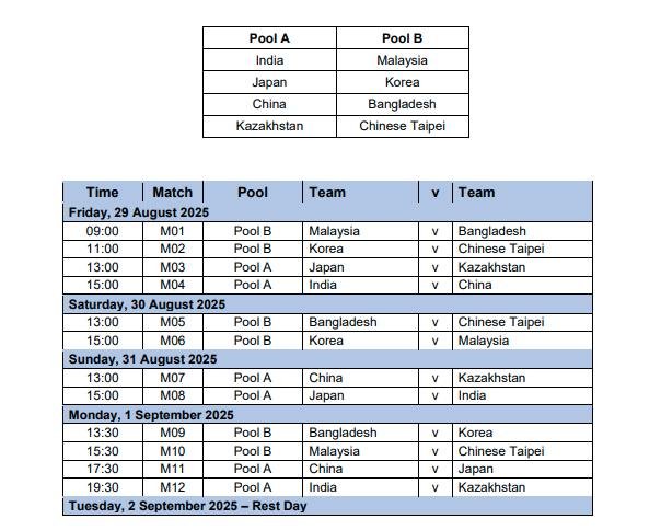 मेजबान भारत को चीन, जापान और कजाखस्तान के साथ ग्रुप ए में रखा गया है जबकि पूल बी में मलेशिया, कोरिया, चीनी ताइपे और बांग्लादेश को जगह मिली है। आठ टीमों के इस टूर्नामेंट के विजेता को नीदरलैंड और बेल्जियम में 2026 में होने वाले विश्व कप में सीधे जगह मिलेगी।