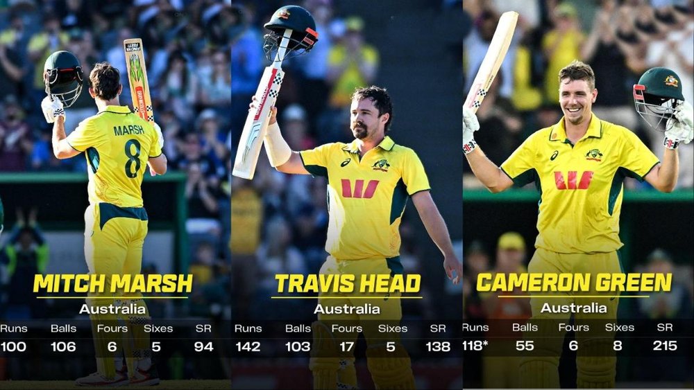 ट्रेविस हेड और मिचेल मार्श के बीच पहले विकेट के लिए 34.1 ओवर में 250 रन की साझेदारी हुई। हेड 103 गेंद पर 17 चौके और 5 छक्के की मदद से 142 रन बनाए। इसके बाद मिचेल मार्श 106 गेंद पर 6 चौके 5 छक्के की मदद से 100 रन बनाकर आउट हुए। तब ऑस्ट्रेलिया का स्कोर 36.3 ओवर में 2 विकेट पर 267 रन था। कैमरन ग्रीन ने 55 गेंद पर नाबाद 118 रन बनाए। उन्होंने 6 चौके और 8 छक्के लगाए। एलेक्स कैरी ने 37 गेंद पर नाबाद 50 रन बनाए। दोनों के बीच नाबाद 167 रन की साझेदारी हुई।