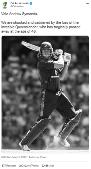 ऑस्ट्रेलिया के पूर्व क्रिकेटर एंड्रयू साइमंड्स नहीं रहे। वह 46 साल के थे। क्रिकेट ऑस्ट्रेलिया की ओर से बताया गया कि एक सड़क दुर्घटना में उनकी जान चली गई। यह हादसा शनिवार (14 मई, 2022) रात को हुआ। वह तब उत्तर पूर्वी ऑस्ट्रेलिया में टाउन्सविले के पास कार क्रैश का शिकार हुए।
