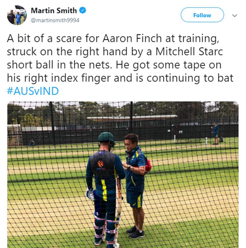ऑस्ट्रेलिया के विस्फोटक ओपनर एरोन फिंच भारत के खिलाफ होने वाले एडिलेड टेस्ट से पहले चोटिल हो गए हैं। प्रैक्टिस सेशन के दौरान तेज गेंदबाज मिशेल स्टार्क की गेंद सीधा जाकर फिंच के दाएं हाथ में लगी। चोट इतनी गहरी थी कि फिंच वहीं बल्ला छोड़ आगे निकल आए। भारत के खिलाफ मैच शुरू होने में महज दो दिनों का समय रह गया है, ऐसे में फिंच का इंजरी से रिकवरी होना ऑस्ट्रेलियाई टीम के लिए बेहद जरूरी है। फिंच के प्लेइंग इलेवन में नहीं होने से ऑस्ट्रेलिया के सामने ओपनिंग की समस्या खड़ी हो सकती है। बता दें कि पृथ्वी शॉ के चोटिल होने के बाद भारतीय टीम भी अपनी सलामी जोड़ी को लेकर संघर्ष कर रही है। एडिलेड ओवल के नेट्स पर बल्लेबाजी करते समय मिशेल स्टार्क की बाउंसर गेंद फिंच के हाथ में लग गई। चोट लगने के बाद फिंच को डॉक्टर की देख-रेख में रखा गया है, लेकिन कुछ देर बाद ही वापस नेट पर बल्लेबाजी करते नजर आए। चोट लगने के बाद वह बेहद कम समय के लिए नेट पर दिखाई दिए।