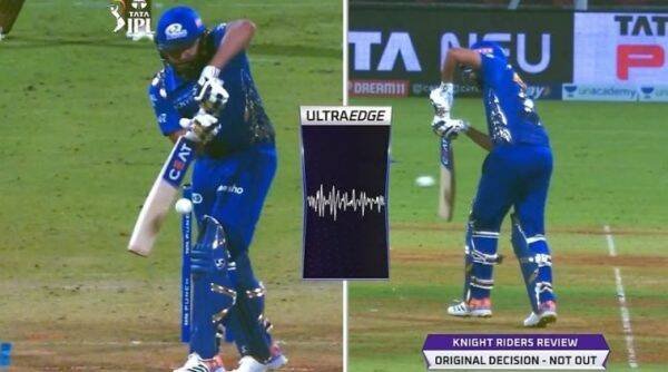 हालांकि, रोहित को आउट देने का फैसला विवादों से भरा रहा। उन्होंने बैक ऑफ द लेंथ गेंद को डिफेंड करने की कोशिश की, लेकिन वह चूक गए और गेंद विकेटकीपर के पास गई। कैच की अपील हुई और अंपायर ने उन्हें नॉट आउट दिया। इसके बाद कोलकाता के कप्तान श्रेयस अय्यर ने रीव्यू लिया। अल्ट्रा एज में स्पाइक दिखा और उन्हें आउट दिया गया।