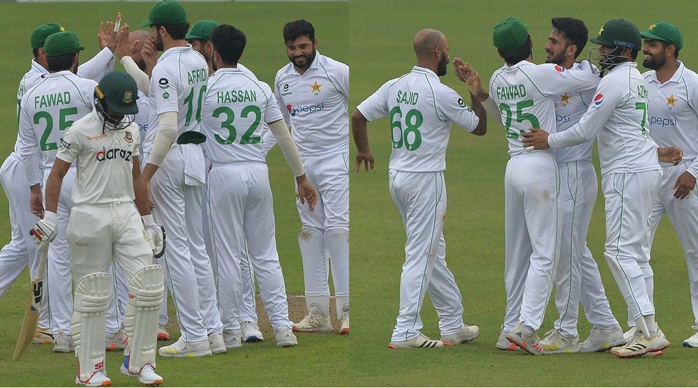 महमूदुल हसन जॉय और मेहदी हसन तो खाता भी नहीं खोल पाए। मुशफिकुर रहीम 5 और विकेटकीपर लिटन दास 6 रन बनाकर पवेलियन लौटे। शादमान इस्लाम भी सिर्फ 3 रन ही बना पाए। पाकिस्तान की ओर से साजिद खान के अलावा और कोई भी गेंदबाज एक भी विकेट नहीं ले पाया।