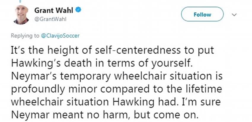 दिग्गज फुटबॉलर नेमार जूनियर बुधवार (14 मार्च) को सोशल मीडिया यूजर्स के निशाने पर आ गए। कारण उनका महान वैज्ञानिक स्टीफन हॉकिंग को खास अंदाज में श्रद्धांजलि देना बना। नेमार ने अपने संदेश के साथ एक तस्वीर भी साझा की। वह इसमें व्हील चेयर पर बैठकर हंसते दिख रहे हैं। इंटरनेट पर जब लोगों ने उनकी यह तस्वीर देखी तो वे भड़क गए। लोगों ने नेमार की इस श्रद्धांजलि पर उनकी कड़ी निंदा की। कहा कि उन्हें ऐसा करने पर शर्म आनी चाहिए। एक यूजर ने इसी क्रम में लिखा, “नेमार को बिल्कुल भी तमीज नहीं है। न ही उन्हें हॉकिंग से किसी प्रकार की सहानुभूति है। उनका सारा पैसा चला जाए और 10 सालों के लिए कर चोरी या जालसाजी के आरोप में वह जेल भेज दिए जाएं।” आपको बता दें कि हॉकिंग भौतिक विज्ञान की दुनिया में अल्बर्ट आइंस्टीन के बाद सबसे महान वैज्ञानिक माने जाते हैं।