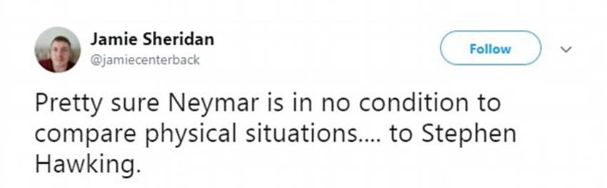 इधर, नेमार की बात करें तो बीते दिनों एक मैच में उन्हें चोट लग गई थी। ब्राजील मूल के खिलाड़ी के पैर में फ्रैक्चर हुआ था, जिसके कारण उन्हें प्लास्टर चढ़ा था। डॉक्टर्स ने इसी वजह से उन्हें व्हील चेयर पर रहने को कहा। नेमार ने इसी दौरान अपनी तस्वीर खिंचवाई और लगे हाथ हॉकिंग को श्रद्धांजलि दे दी। नेमार ब्राजील की नेशनल टीम और फ्रांस के पेरिस सेंट जर्मेन फुटबॉल क्लब से खेलते हैं। उन्होंने 14 मार्च को हॉकिंग के विचारों को दोहराते हुए यह ट्वीट किया था-
