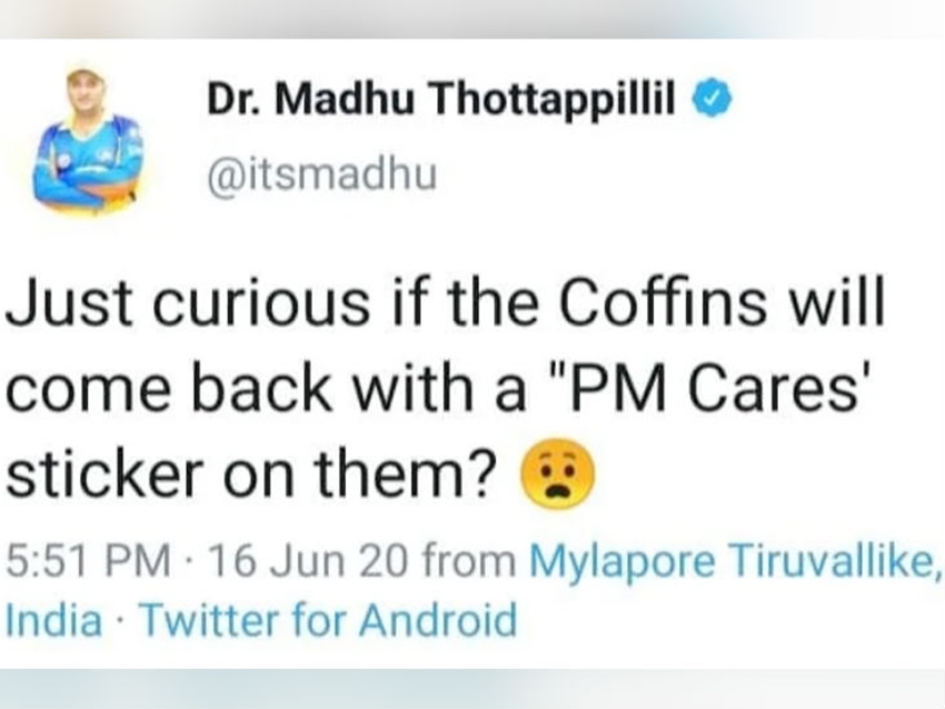 मीडिया रिपोर्ट्स के मुताबिक, मधु थोट्टापिल्ली ने अपने ट्वीट में शहीद जवानों पर असंवेदनशील टिप्पणी की थी। इसके बाद चेन्नई सुपरकिंग्स ने पूरे मामले पर खेद जताया। दरअसल डॉ. मधु ने अपने ट्वीट में लिखा था, ‘मैं यह जानने को उत्सुक हूं कि जो ताबूत वापस आएंगे, क्या उस पर पीएम केयर्स का स्टीकर लगा होगा।’ उन्होंने इशारों-इशारों में प्रधानमंत्री नरेंद्र मोदी पर निशाना साधा था। हालांकि, विवाद बढ़ने के बाद डॉ. मधु ने अपना ट्विटर अकाउंट लॉक कर दिया है।