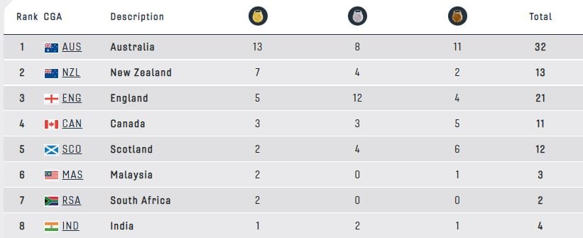 13 गोल्ड, 8 सिल्वर और 11 ब्रॉन्ज अपने नाम किया है। अबतक कुल 32 पदक जीते हैं। दूसरे नंबर पर न्यूजीलैंड ने अबतक 13 पदक जीते हैं, लेकिन इनमें से 7 गोल्ड हैं। इंग्लैंड ने अबतक कुल 21 मेडल जीते हैं और वह तीसरे नंबर पर है। कनाडा 11 मेडल के साथ चौथे नंबर पर है। स्कॉटलैंड 12 मेडल के साथ पांचवें नंबर पर है।