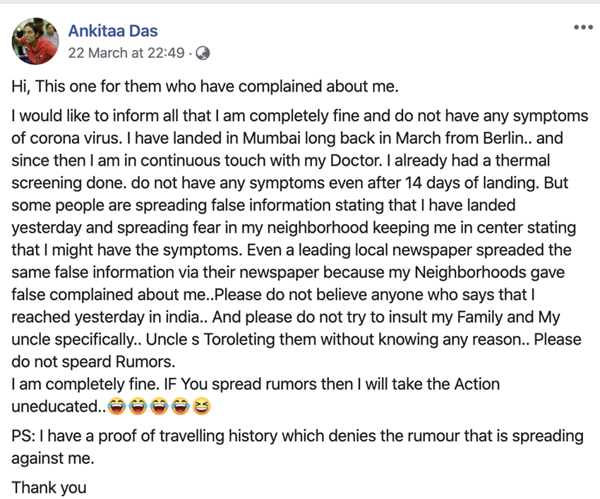 26 साल की टेबल टेनिस खिलाड़ी ने कहा कि वह 10 मार्च को जर्मनी से आईं। उन्होंने मुंबई से सिलीगुड़ी तक का सफर विमान से किया। घर पहुंचने पर वे सेल्फ आईसोलेशन में चली गईं। हालांकि, क्षेत्रीय भाषा के समाचार पत्र में छपी गलत खबर और उनके पड़ोसी द्वारा सोशल मीडिया पर किए गए आपत्तिजनक कमेंट के कारण उन्होंने खुद को बहुत अपमानित महसूस किया। लोगों ने फोन कर स्थानीय पार्षद से मेरी शिकायत भी की।