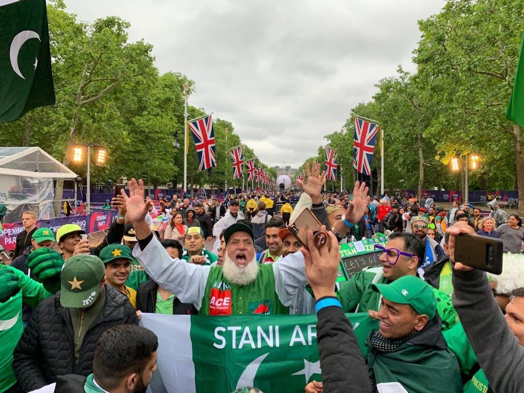 लंदन में क्रिकेट वर्ल्ड कप की ओपनिंग पार्टी के कुछ देर पहले अपनी टीम को सपोर्ट करने को लेकर टीम की जर्सी और झंडे के साथ खड़े फैंस। (फोटोः टि्वटर/@cricketworldcup)