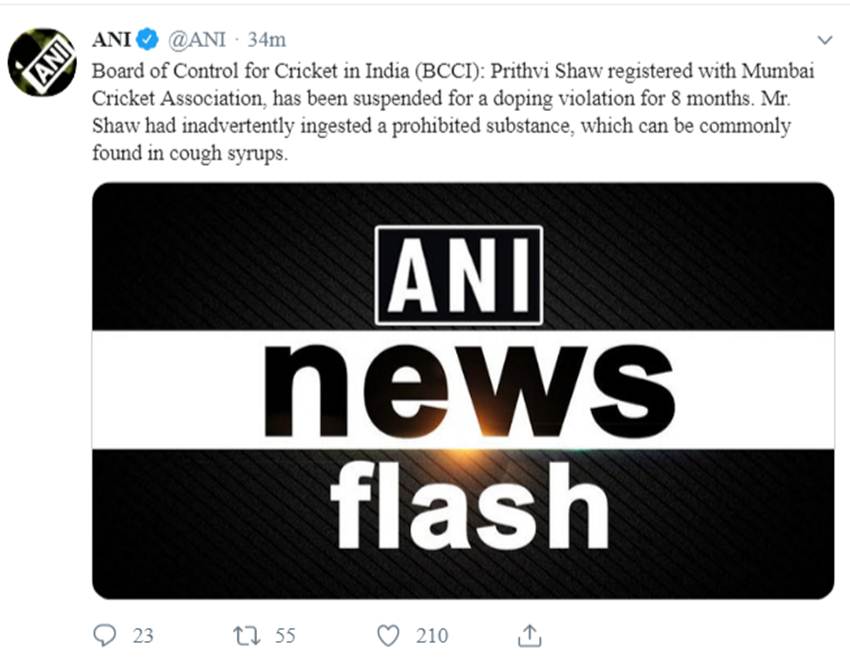 बीसीसीआई के मुताबिक, फरवरी 2019 में पृथ्वी शॉ का यूरिन टेस्ट सैयद मुश्ताक अली ट्रॉफी के दौरान एंटी डोपिंग प्रोग्राम के तहत किया गया था। टेस्ट में Terbutaline पाया गया, जो प्रतिबंधित है जिसके चलते अब उन्हें निलंबन झेलना पड़ेगा।