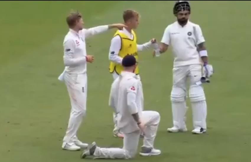 भारत और इंग्लैंड के बीच नॉटिंघम के ट्रेंट ब्रिज में तीसरा टेस्ट मैच खेला जा रहा है। भारत ने इस मैच में अपनी जीत लगभग पक्की कर ली है। लेकिन शानदार प्रदर्शन कर रही टीम इंडिया और मेजबान इंग्लैंड के खिलाड़ियों के बीच मैदान में जबरदस्त खेल भावना देखने को मिली है। मैदान में ब्रेक के दौरान इंग्लैंड के खिलाड़ी अपनी ड्रिंक पी रहे थे। उन्होंने भारतीय कप्तान विराट कोहली को भी ड्रिंक आॅफर की। विराट ने भी बिना हिचक दिखाए इंग्लैंड के खिलाड़ी से ड्रिंक ली और पीने के बाद उसे बोतल वापस कर दी। दोनों टीमों के बीच एक-दूसरे के साथ ड्रिंक साझा करने को क्रिकेट में खेल भावना के नए युग की शुरुआत कहा जा सकता है।