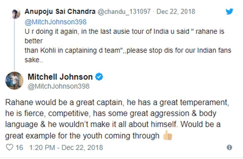 ऑस्ट्रेलियन पूर्व तेज गेंदबाज मिशेल जॉनसन ने भारतीय कप्तान विराट कोहली की कप्तानी पर एक बार फिर सवाल खड़े किए हैं। इस बार जॉनसन ने कोहली की तुलना भारतीय उपकप्तान अजिंक्य रहाणे से की और रहाणे को विराट से बेहतर कप्तान बताया। जॉनसन ने सोशल मीडिया पर ट्वीट कर लिखा, ‘अजिंक्य रहाणे एक महान कप्तान होंगे, उनका स्वभाव बेहद अच्छा है, उनका टैंपरामेंट दूसरे खिलाड़ियों की तुलना में काफी अधिक है। मैदान पर उनकी शारीरिक भाषा बतौर खिलाड़ी सहज रहता है। वह आने वाले युवाओं के लिए बेहतरीन उदाहरण होंगे।’ गौरतलब है कि दूसरे टेस्ट मैच के दौरान कोहली और पेन बीच जुबानी जंग देखने को मिली थी जिसके कारण एक बार तो मैदानी अंपायर क्रिस गफाने को भी बीच में हस्ताक्षेप करना पड़ा था। भारत को इस मैच मेजबान ऑस्ट्रेलिया के हाथों 146 रनों से करारी हार का सामना करना पड़ा था। जॉनसन ने इसके बाद भारतीय कप्तान की काफी आलोचनाएं की थी।