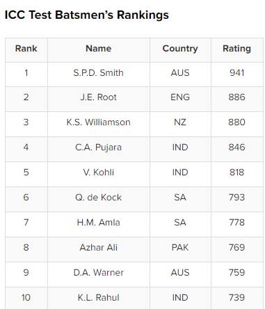 बल्लेबाजों की रैंकिंग की बात करें तो शीर्ष 10 बल्लेबाजों में हाशिम आमला की वापसी हुई है। वह 7वें नंबर पर हैं। 941 की रेटिंग के साथ अॉस्ट्रेलियाई कप्तान स्टीव स्मिथ पहले पायदान पर हैं। वहीं इंग्लैंड के जो रूट दूसरे, न्यूजीलैंड के कप्तान केन विलियमसन तीसरे पायदान पर हैं। चौथे और पांचवे स्थान पर भारतीय बल्लेबाजों का कब्जा है। 846 की रेटिंग के साथ चेतेश्वनर पुजारा और 818 रेटिंग के साथ विराट कोहली क्रमश: चौथे और पांचवे पायदान पर हैं। कई बल्लेबाजों ने लंबी छलांग भी लगाई है। जिम्बाब्वे के क्रेग इरविन 20 पायदान की छलांग लगाकर 40वें और सिकंदर रजा 28 स्थानों का फायदा पाकर 48वें स्थान पर आ गए हैं।