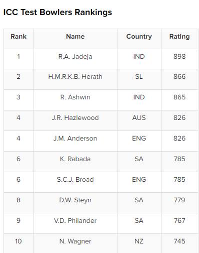 आईसीसी ने टेस्ट रैंकिंग जारी कर दी हैं। भारतीय गेंदबाज रविचंद्रन अश्विन को एक पायदान का नुकसान हुआ है। अब वह तीसरे पायदान पर आ गए हैं। मंगलवार को जिम्बाब्वे के खिलाफ मैच में 10 विकेट लेने वाले श्रीलंका के स्पिनर रंगना हेराथ दूसरे पायदान पर पहुंच गए हैं। यह मैच श्रीलंका ने 4 विकेट से जीता था। 898 की रेटिंग के साथ रवींद्र जाडेजा पहले पायदान पर काबिज हैं। रंगना हेराथ की 866 और अश्विन की 865 रेटिंग हैं। यह आंकड़ा दिलचस्प इसलिए है, क्योंकि भारतीय टीम श्रीलंका के साथ 26 जुलाई से टेस्ट मैच खेलेगी। इन दोनों स्पिनर्स पर नंबर 2 के पायदान के लिए जंग देखने को मिलेगी। 39 साल के रंगना हेराथ टेस्ट क्रिकेट में कामयाब गेंदबाज माने जाते हैं। उन्होंने महज 81 टेस्ट मैचों में 384 विकेट चटकाए हैं। चौथे नंबर पर 826 पायदान के साथ जोश हेजलवुड और पांचवे नंबर पर इंग्लैंड के जेम्स एंडरसन हैं।