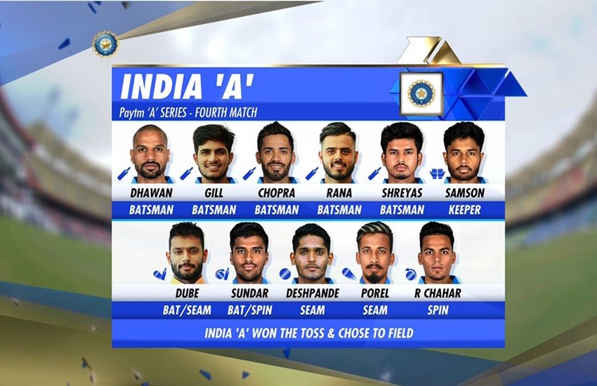 भारत ए: श्रेयस अय्यर (कप्तान), शिखर धवन, शुभमन गिल, प्रशांत चोपड़ा, नितीश राणा, संजू सैमसन (विकेटकीपर), शिवम दुबे, वॉशिंगटन सुंदर, तुषार देशपांडे, इशान पोरेल, राहुल चहर।