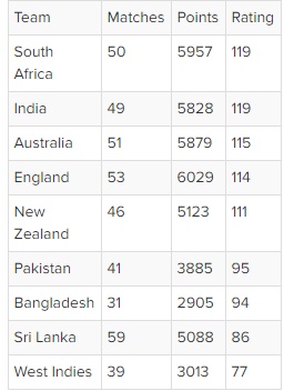 ऑस्ट्रेलिया के खिलाफ चौथे वनडे में मिली हार के बाद टीम इंडिया का ना सिर्फ 5-0 से सीरीज जीतने का सपना टूट गया बल्कि आईसीसी वनडे रैंकिंग में भी टीम को नंबर वन का ताज गंवाना पड़ा। टीम इंडिया को 21 रनों से मिली हार के बाद एक बार फिर दक्षिण अफ्रीका 5957 अंकों के साथ पहले नंबर पर पहुंच गया है। वर्तमान में टीम इंडिया के 5828 अंक हैं जबकि 5879 अंकों के साथ ऑस्ट्रेलिया तीसरे पायदान पर है।