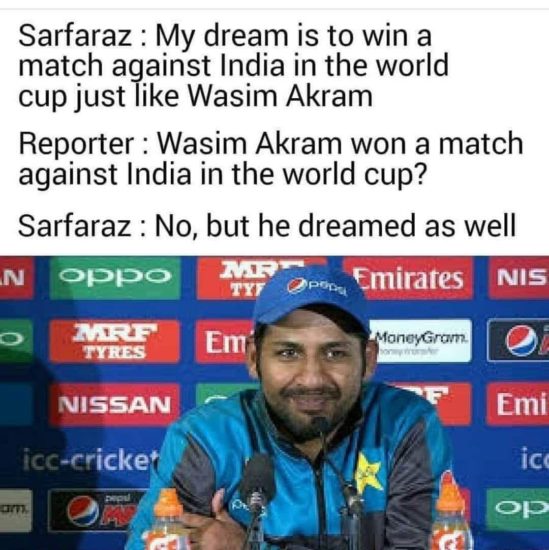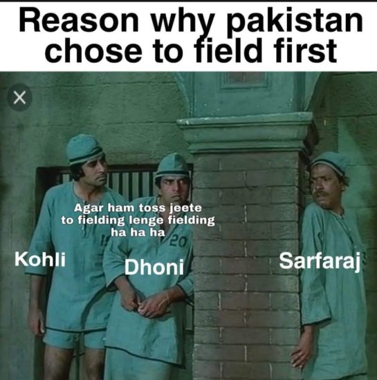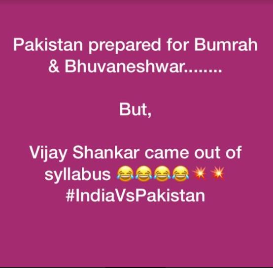 इसपर कप्तान कोहली ने उनका ओवर पूरा करने के लिए विजय शंकर को बुलाया। मगर उन्होंने सबको चौंकाते हुए इमाम-उल-हक को चलता कर दिया। विजय शंकर विकेट झटक चुके हैं इसका यकीन दोनों टीमों के प्रशंसकों को भी नहीं हुआ कि आखिर हुआ क्या। बरहाल पाकिस्तानी खिलाड़ी को आउट करने पर सोशल मीडिया में ट्विटर यूजर्स वियज शंकर पर जमकर मजे ले रहे हैं। कुछ यूजर्स ने टॉस जीतने के बाद भी बल्लेबाजी ने चुनने पर कप्तान सरफराज की खूब आलोचना की। सोशल मीडिया में पाक कप्तान की आलोचना करने वाला एक मीम खूब वायल हो रहा है जिसमें ‘शोले’ फिल्म का सीन दिखाते हुए लिखा गया, ‘अगर हम टॉस जीते तो पहले फील्डिंग लेंगे…फील्डिंग।’ एक मीम में लिखा गया, ‘पाकिस्तान ने बुमराह और भुवनेश्वर की तैयारी की थी। विजय शंकर ऑउट ऑफ सिलेबस आ गया।’