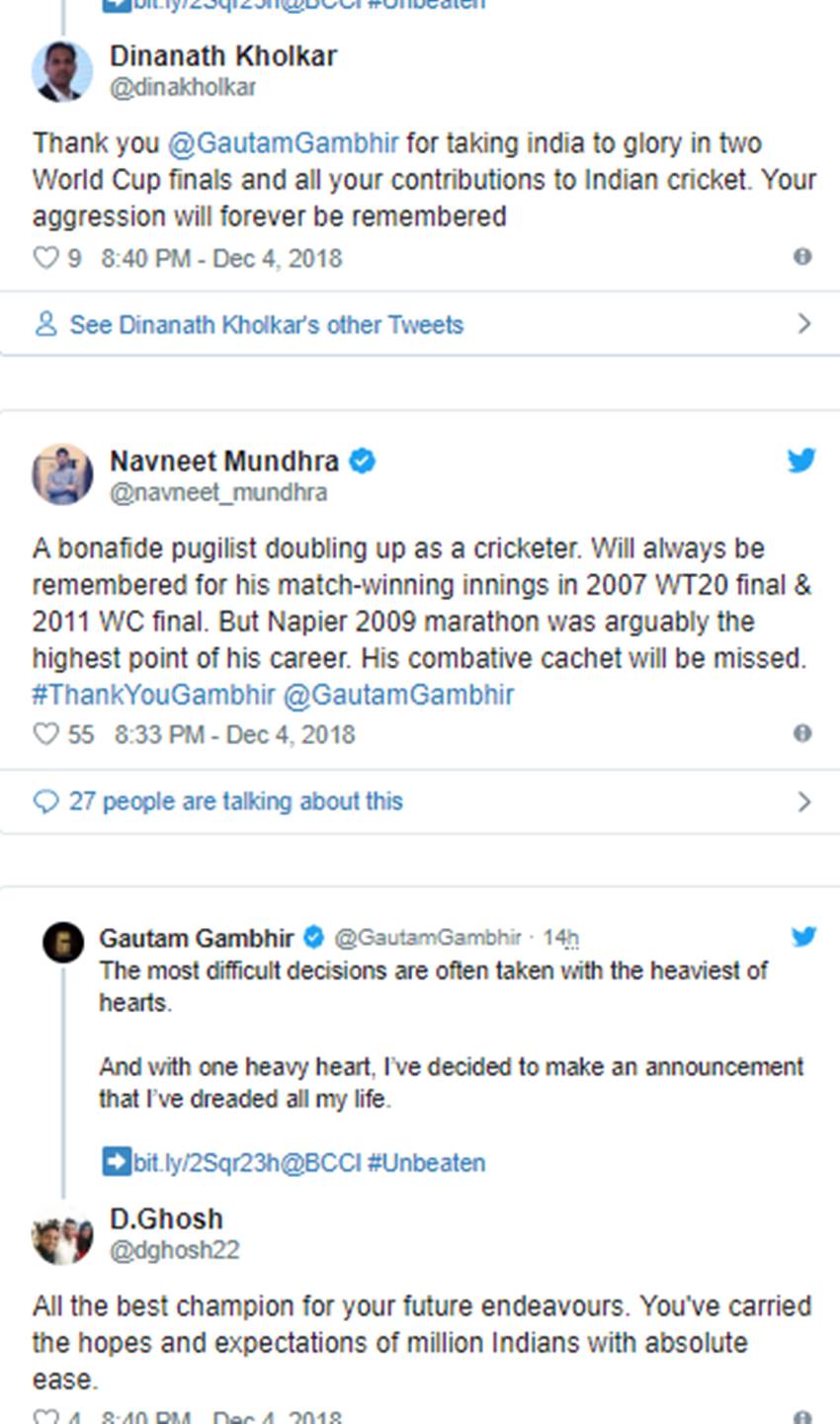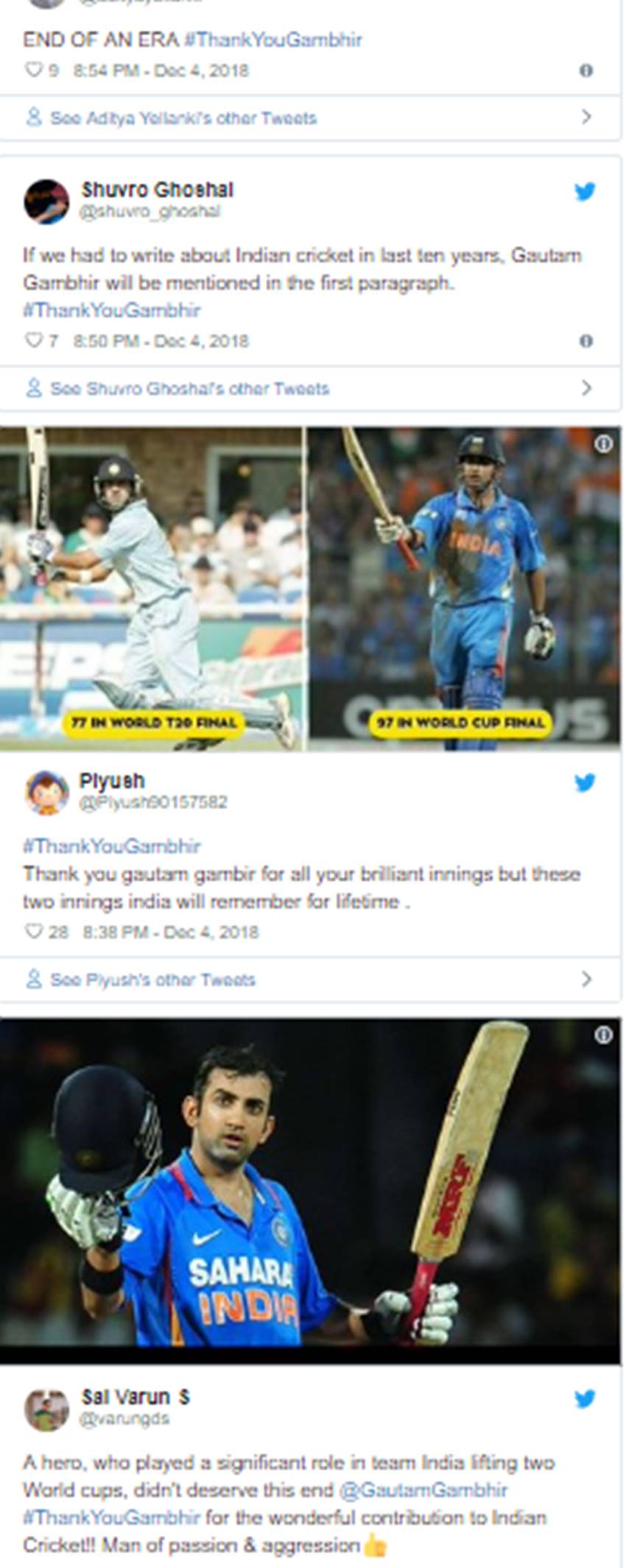 गौतम गंभीर के संन्यास की खबरों के बाद से ही सोशल मीडिया पर क्रिकेट के दिग्गज और फैंस भारतीय टीम में इतने सालों तक अहम योगदान देने कि लिए #ThankYouGambhir कर शुक्रिया अदा कर रहे हैं। गंभीर अपने दो दशक के क्रिकेट करियर के दौरान गंभीर भारत के अलावा दिल्ली, दिल्ली डेयरडेविल्स, एसेक्स, कोलकाता नाइट राइर्डस के लिए खेले। कोलकाता नाइट राइर्डस के कप्तान के तौर पर गंभीर ने दो बार आईपीएल खिताब जीते हैं। वह दिल्ली की रणजी टीम तथा डेयरडेविल्स टीम के भी कप्तान रहे हैं।