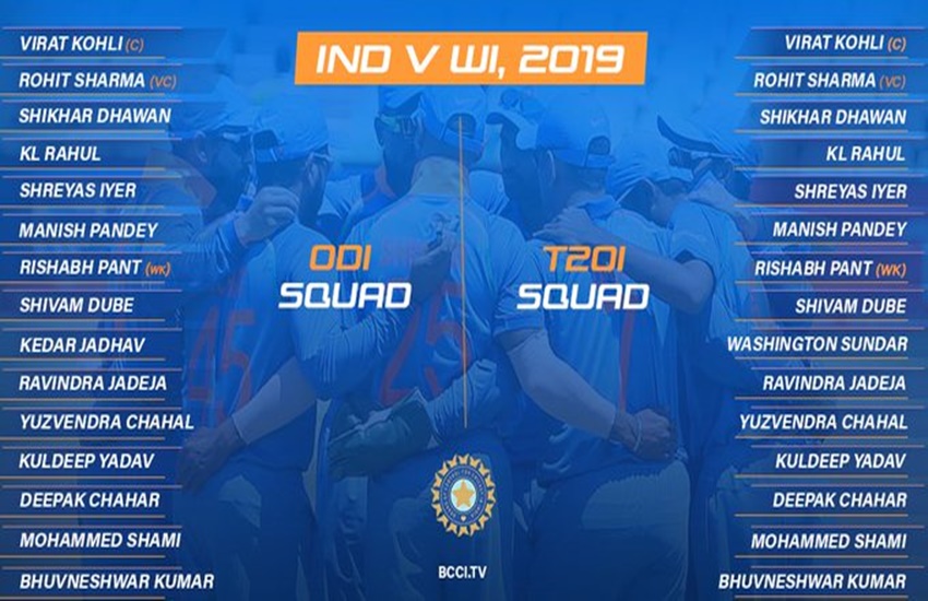 West Indies के खिलाफ टी-20 टीम: विराट कोहली, रोहित शर्मा, केएल राहुल, शिखर धवन, ऋषभ पंत, मनीष पांडे, श्रेयस अय्यर, शिवम दूबे, रवींद्र जडेजा, वाशिंगटन सुंदर, युजवेंद्र चहल, कुलदीप यादव, दीपक चाहर, भुवनेश्वर कुमार, मोहम्मद शमी।