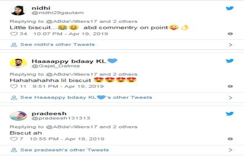 कोहली की शानदार पारी पर उनके टीम के साथी खिलाड़ी एबी डिविलयर्स ने ट्वीट कर कोहली को निकनेम दिया। उन्होंने कोहली को ‘लिटल बिस्कुट’ कहा। उनके इस ट्वीट पर यूजर ने भी कमेंट कर कोहली के निकनेम को काफी पसंद किया। आरसीबी के कप्तान को इससे पहले लोग ‘चिकू’ और ‘किंग कोहली’ जैसे निकनेम से पुकारते रहे हैं लेकिन इसबार फैन्स ने उनके इस निकनेम पर काफी अच्छी प्रतिक्रिया दी।