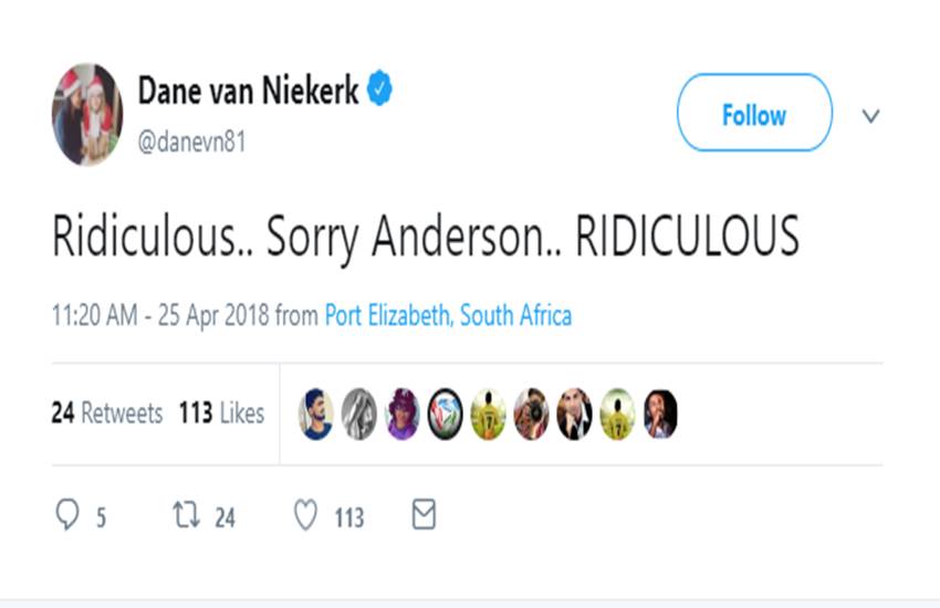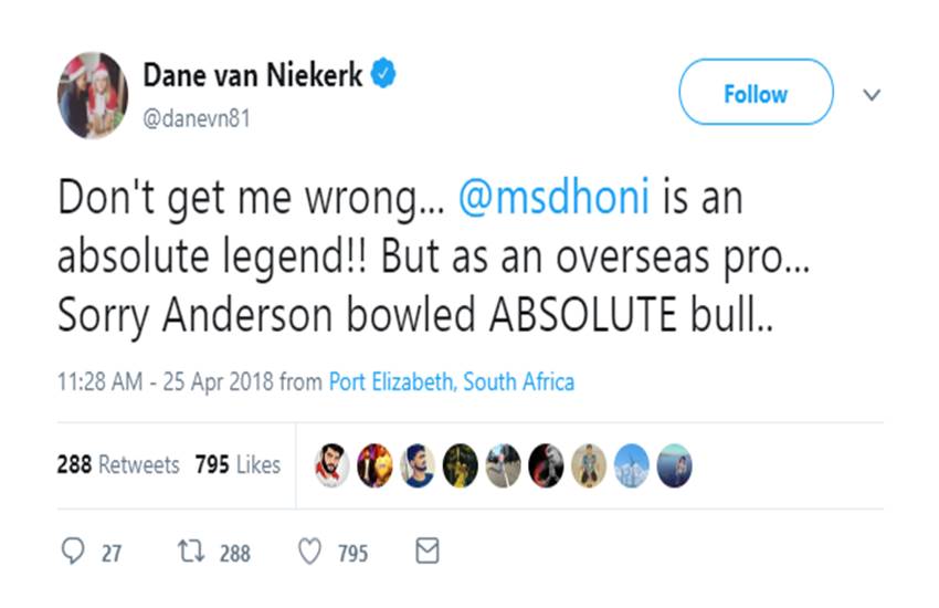 दक्षिण अफ्रीका की महिला क्रिकेटर डेन वैन निकार्क ने ट्वीट कर कहा है कि ‘डेथ ओवरों में एंडरसन शॉट लेंथ गेंद क्यों डाल रहे थे? बेतुका’। अपने दूसरे ट्वीट में भी वैन निकार्क ने एंडरसन को निशाने पर लिया और लिखा कि ‘बेतुका, माफ करना एंडरसन…बेतुका’। इतना ही नहीं अपने एक और ट्वीट में इस खिलाड़ी ने चेन्नई सुपर किंग्स के कप्तान महेंद्र सिंह धोनी की तारीफ करते हुए लिखा कि ‘मुझे गलत मत समझिए। एमएस धोनी एक लिजेंड हैं। लेकिन माफ करना एंडरसन आपने गेंदबाजी बहुत खराब की’।