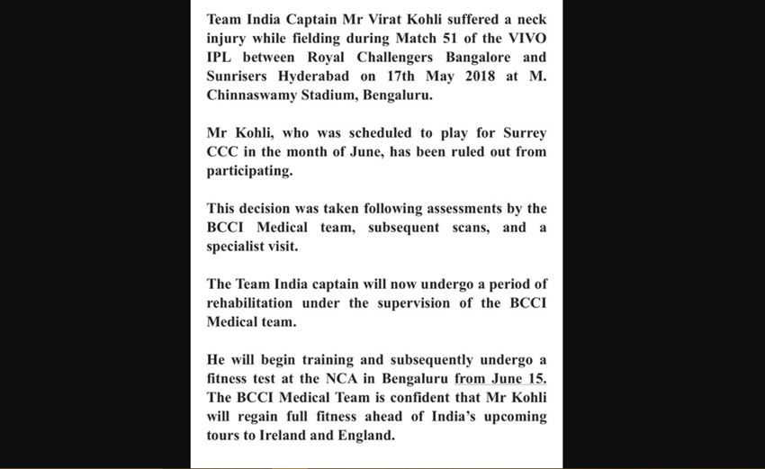 बीबीसीआई ने गुरुवार को जारी एक बयान में कहा, “17 मई को एम चिन्नास्वामी स्टेडियम में सनराइजर्स हैदराबाद के खिलाफ खेले गए मैच में कोहली को गर्दन पर चोट लगी थी। बोर्ड की मेडिकल टीम की जांच द्वारा यह फैसला लिया गया है कि वह जून में इंग्लिश काउंटी क्लब सरे के लिए नहीं खेलेंगे। बोर्ड को पूरा यकीन है कि कोहली आयरलैंड और इंग्लैंड के दौरे से पहले पूरी तरह से फिट हो जाएंगे।”