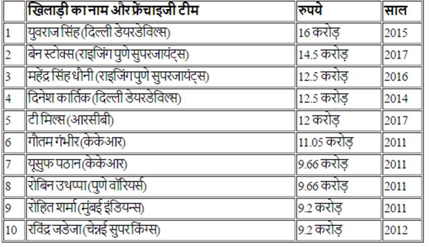 इस साल 5 अप्रैल से इंडियन प्रीमियर लीग के दसवें सीजन की शुरूआत हो रही है। इसके लिए गत 20 फरवरी को बेंगलुरू में खिलाड़ियों की नीलामी की गई, जिसमें इंग्लैंड के आॅलराउंडर बेन स्टोक्स सबसे महंगे खिलाड़ी बनकर उभरे। उन्हें राइजिंग पुणे सुपरजाएंट्स ने 14.5 करोड़ रुपये में खरीदा। बेन स्टोक्स की आधार कीमत 2 करोड़ रुपये थी। वहीं, इस साल नीलामी में दूसरे सबसे महंगे क्रिकेटर रहे बने स्टोक्स के ही हमवतन टाइमल मिल्स। मिल्स को रॉयल चैलेंजर्स बेंगलुरू ने 12 करोड़ रुपये में खरीदा। हम आपको आईपीएल के पहले सीजन से लेकर दसवें सीजन तक के दस सबसे महंगे खिलाड़ियों के बारे में बता रहे हैं…