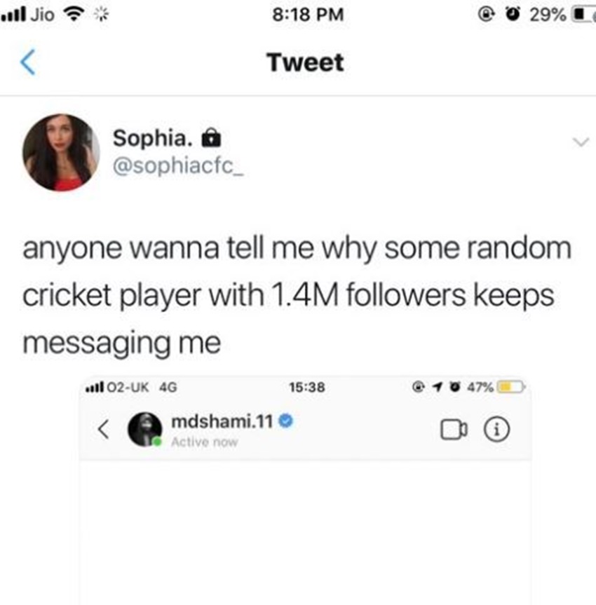 महिला ने इंस्टाग्राम पर उनका स्क्रीनशॉट शेयर करते हुए लिखा है कि जिसके पहले से ही 14 लाख फॉलोवर्स हैं वो मुझे बार-बार क्यों मैसेज कर रहा है। महिला के अनुसार शमी ने उस महिला को बार-बार गुड ऑफ्टरनून का मैसेज भेजा है।शोफिया नाम की महिला ने ट्विटर पर स्क्रीनशॉट शेयर करते हुए यह बात लिखी है।बता दें कि श्रीलंका के खिलाफ मोहम्मद शमी को आराम दिया गया था। न्यूजीलैंड के खिलाफ भी शमी को खेलने का मौका नहीं मिला है। शमी इस विश्व कप की पहली हैट्रिक ले चुके हैं।