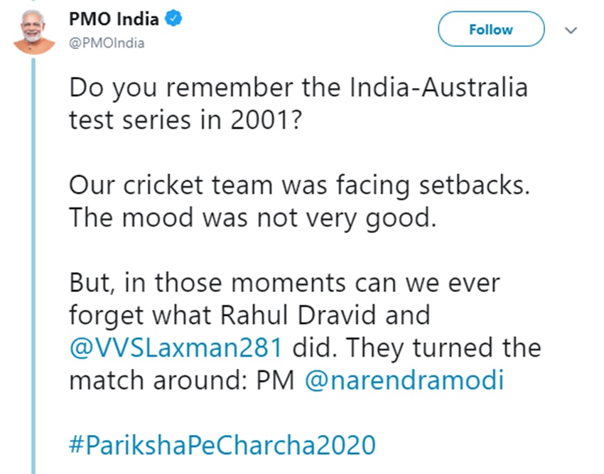 प्रधानमंत्री नरेंद्र मोदी ने सोमवार को स्टूडेंट्स को एग्जाम में तनाव से मुक्ति पाने लिए कुछ कारगर उपाय सुझाते हुए क्रिकेट खिलाड़ियों द्वारा अपनाए जाने वाले कुछ तरीके सुझाए। मोदी ने छात्रों से परीक्षा में जाने से पहले अपने पेन कॉपी आदि को ठीक करने जैसी परीक्षा से जुड़ी गतिविधियों में एक दो मिनट के लिये खुद को शामिल करने का सुझाव देते हुए कहा कि ऐसा करने से वे परीक्षा जनित तनाव से मुक्ति पा सकेंगे। उन्होंने इस दौरान कुछ क्रिकेटरों का उदाहरण देते हुए भारतीय टीम की ऐतिहासिक जीत के बारे में चर्चा की। राहुल द्रविड़ और वीवीएस लक्ष्मण द्वारा साल 2001 में ऑस्ट्रेलिया के खिलाफ खेले गए टेस्ट मैच को याद करते हुए पीएम मोदी ने बच्चों को उनकी सहासी पारियों से प्रेरणा लेने की बात कही। कोलकाता टेस्ट की चर्चा करते हुए उन्होंने बच्चों को इन दोनों बल्लेबाजों के जूझारू पारियों से सीख लेने की बात कही।