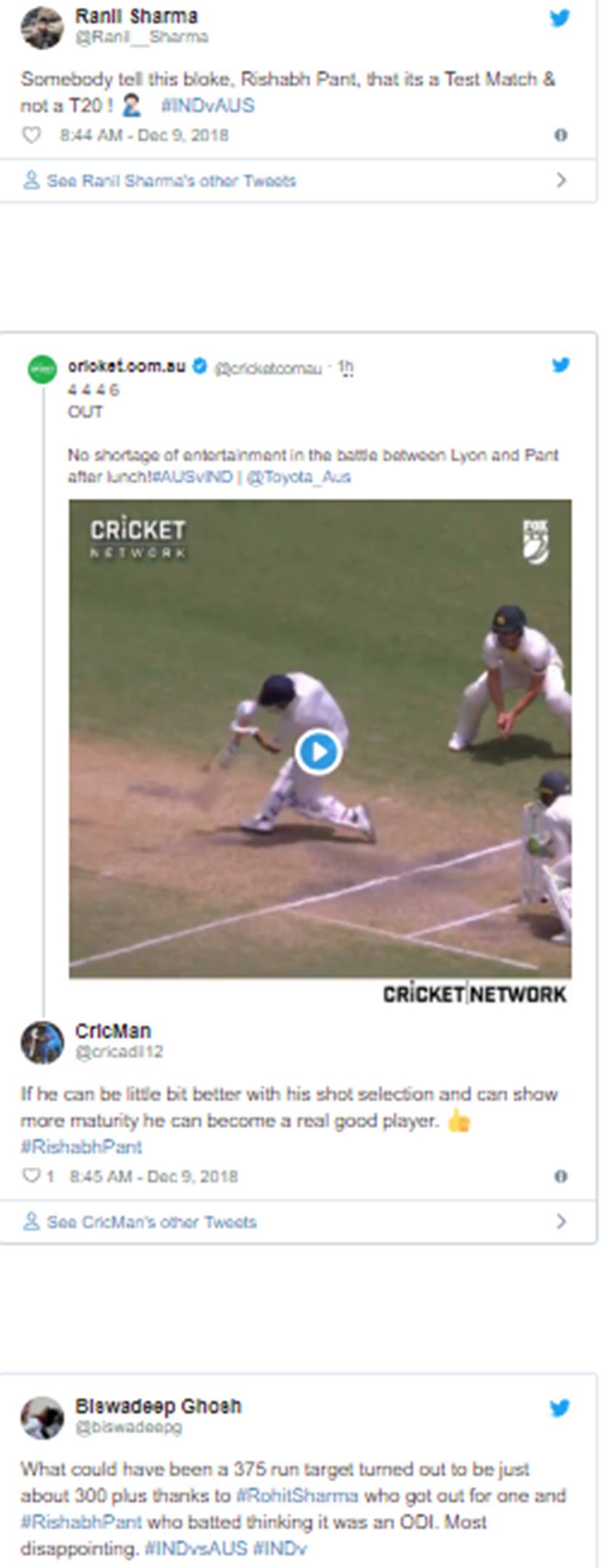 Ind vs Aus 1st Test: भारतीय टीम के युवा विकेटकीपर बल्लेबाज ऋषभ पंत ने ऑस्ट्रेलिया के खिलाफ दूसरी पारी में 28 रन बनाए। यह 28 रन पंत ने महज 16 गेंदों में लगाया, इस दौरान उन्होंने नाथन लॉयन के एक ही ओवर में तीन चौके और एक छक्का जड़ा। हालांकि, वह अपनी ताबड़तोड़ पारी को ज्यादा आगे नहीं बढ़ा सकें। पंत की पारी को देखने के बाद सोशल मीडिया पर फैंस लगातार उन्हें ट्रोल कर रहे हैं। दरअसल, ऑस्ट्रेलिया के खिलाफ भारतीय टीम पहले टेस्ट मैच में मजबूत दिखाई पड़ रही थी, लेकिन पंत की एक गलती की वजह से पूरी टीम महज 307 रन बनाकर ऑल आउट हो गई। फैंस उम्मीद कर रहे थे कि भारत चौथी पारी में ऑस्ट्रेलिया के सामने कम से कम 375 या 400 का लक्ष्य रखेगी। हालांकि, टीम ऐसा करने में नाकाम रही और ऑस्ट्रेलिया को मैच जीतने का एक मौका दे दिया। ऑस्ट्रेलियाई बल्लेबाज अगर चौथी पारी के दौरान संभली हुई बल्लेबाजी करते हैं तो वह इस लक्ष्य को आसानी से हासिल कर लेंगे।