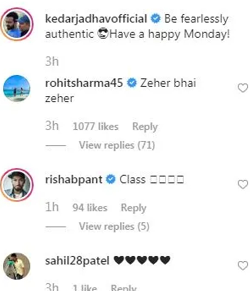 इस तस्वीर में चश्मा लगाकर जाधव ने हाथ में बल्ला थाम रखा था। जाधव की इस तस्वीर पर भी रोहित शर्मा ने कमेंट करते हुए लिखा था, ‘पोज कम मार, बैटिंग कर ले थोड़ा। बता दें कि जाधव मौजूदा टी-20 सीरीज में भारतीय टीम का हिस्सा नहीं हैं, लेकिन वनडे सीरीज में उन्हें टीम में जगह दी गई है।