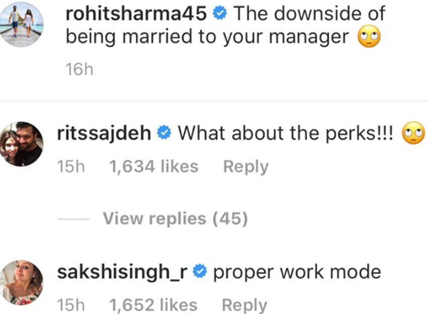 रोहित ने रितिका को बिना बताए एक तस्वीर ली, इस दौरान वह काम कर रही थी। इस तस्वीर को रोहित ने इंस्टाग्राम पर शेयर कर कैप्शन में लिखा, ”मैनेजर से शादी करने के ये नुकसान हो सकते हैं। इसके जवाब में रितिका ने लिखा, ”सैलेरी के बारे में क्या ख्याल है। वहीं युवराज सिंह ने इन दोनों के बातचीत के बीच एक स्माइल की इमोजी कमेंट किया। पूर्व कप्तान महेंद्र सिंह धोनी की वाइफ साक्षी ने इस तस्वीर पर कमेंट करते हुए लिखा, ”प्रोपर काम करना इसे कहते हैं।