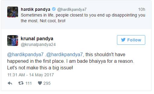 इस बीच दोनों भाईयों के बीच कुछ अनबन की खबरें आ रही हैं। गत शनिवार को मुंबई इंडियंस और कोलकाता नाइट राइडर्स के बीच हुए मैच के बाद हार्दिक पांड्या ने एक ट्वीट किया। इसके बाद से ही यह कयास लगाए जा रहे हैं कि दोनों भाईयों के बीच सबकुछ ठीक नहीं है। हार्दिक पांड्या ने ट्वीट किया, ‘कभी कभी जिंदगी में जो आपके सबसे करीब होता है, वही सबसे अधिक आपको निराश करता है।’ इसके बाद कुणाल ने भी ट्वीट किया, ‘मैं किसी वजह से ही बड़ा भाई हूं, इसे बड़ा मुद्दा मत बनाओ।’ इस तरह की बातचीत के बाद ट्विटर पर दोनों के बीच झगड़ा होने के बारे में बाते की जा रही हैं। हालांकि, अभी यह पुख्ता तौर पर पता नहीं चल सका है कि मामला क्या है। इस बीच दोनों के इस ट्वीट के बाद पूर्व विस्फोटक बल्लेबाज वीरेंद्र सहवाग ने भी एक ट्वीट कर दोनों भाईयों को लड़ाई नहीं करने की सलाह दी है।