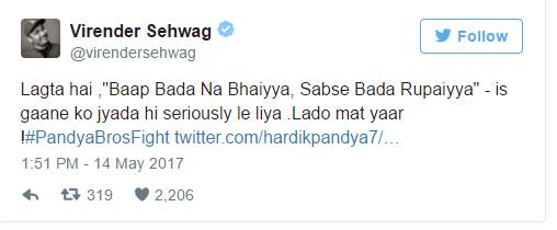 वीरू ने अपने ट्वीट में लिखा, ‘बाप बड़ा ना भैया, सबसे बड़ा रुपैया। इस गाने को ज्यादा ही गंभीरता के साथ ले लिया। लड़ो मत यार।’ गौरतलब है कि आईपीएल 2017 के अपने आखिरी राउंड रोबिन लीग मुकाबले में मुंबई इंडियंस ने कोलकाता नाइट राइडर्स को 9 रनों से हरा दिया। इस मैच के आखिरी ओवर में कोलकाता को जीत के लिए 14 रन बनाने थे। हार्दिक पांड्या ने सिर्फ 4 रन दिया और मुंबई ने जीत के साथ अंकतालिका में शीर्ष स्थान पर अपना कब्जा कायम रखा।