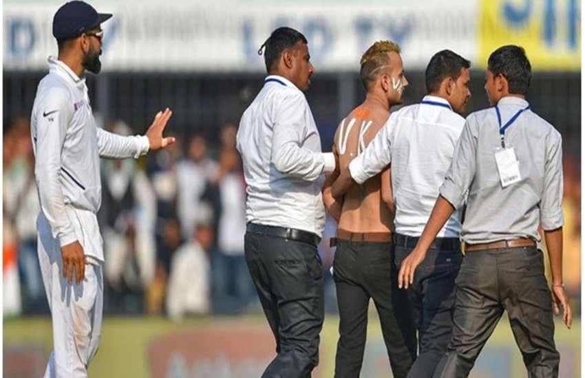IND vs BAN, 1st Test, Bangladesh tour of India, 2019: भारत-बांग्लादेश टेस्ट मैच के दौरान शनिवार को सुरक्षा व्यवस्था को धता बताते हुए होलकर स्टेडियम के मैदान में घुसे 22 वर्षीय युवक को गिरफ्तार कर लिया गया। वह भारतीय कप्तान विराट कोहली का बड़ा प्रशंसक है और उन्हीं से मिलने की ख्वाहिश पूरी करने के लिये उसने यह हरकत की थी।पुलिस अधिकारियों ने बताया कि अंतरराष्ट्रीय मैच के दौरान मैदान में घुसे युवक पर नजर पड़ते ही उसे पकड़कर हिरासत में ले लिया गया। बाद में मध्यप्रदेश क्रिकेट संघ (एमपीसीए) की शिकायत पर उसे भारतीय दंड विधान की धारा 448 (किसी स्थान पर अनधिकृत प्रवेश) के तहत गिरफ्तार कर लिया गया।उन्होंने बताया कि गिरफ्तार युवक की पहचान सूरज सिंह बिष्ट (22) के रूप में हुई है। वह मूलत: उत्तराखंड का रहने वाला है। वह इंदौर के भंवरकुआं इलाके के एक होटल में कुक है।