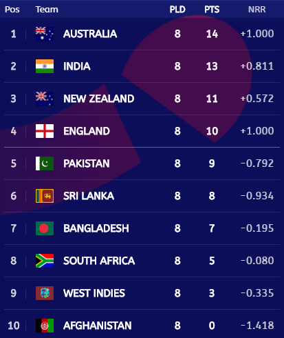 इसके अलावा 13 अंकों के साथ भारत और 14 अंकों के साथ ऑस्ट्रेलिया पहले ही सेमीफाइनल में अपनी जगह पक्की कर चुके हैं। इन दोनों टीमों के भी एक-एक मैच बाकी हैं। भारत का अगला मैच श्रीलंका से है जो अब महज एक औपचारिकता होगी। वहीं ऑस्ट्रेलिया दक्षिण अफ्रीका से भिड़ेगा।