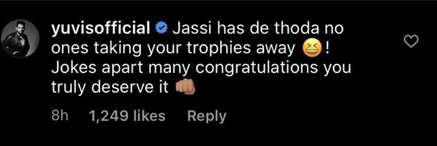 भारतीय टीम के तेज गेंदबाज जसप्रीत बुमराह को रविवार को पॉली उमरीगर अवॉर्ड से सम्मानित किया गया। साल 2018-19 में अंतरराष्ट्रीय क्रिकेट में शानदार प्रदर्शन के लिए उन्हें प्रतिष्ठित पॉली उमरीगर अवॉर्ड और दिलीप सरदेसाई अवॉर्ड दिया गया। इस अवॉर्ड को पाने के बाद जसप्रीत बुमराह ने अपनी एक तस्वीर सोशल मीडिया पर शेयर की। इस तस्वीर पर पूर्व ऑलराउंडर खिलाड़ी युवराज सिंह ने बेहद फनी कमेंट किया। एक तरफ जहां सभी फैंस और उनके वेल विशर उन्हें बधाइयां दे रहे थे तो वहीं युवी ने बुमराह को हंसने की नसीहत दे दी। युवी ने लिखा, ‘जस्‍सी हंस दे थोड़ा, कोई तेरा अवॉर्ड तुझसे छीन कर नहीं ले जा रहा है।’ हालांकि, उन्होंने अपनी इस बात को मजाक बताया और इसके तुरंत बाद बुमराह को बधाई देते हुए कहा कि तुम इसे डिजर्व करते हो।