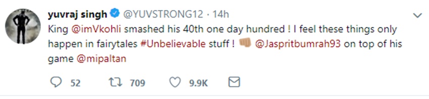 युवराज सिंह ने विराट की तारीफ करते हुए ट्वीट कर लिखा, विराट कोहली ने 40वां शतक जड़ा, मुझे लगता है कि यह सब केवल कहानियों में होता है।बुमराह की तारीफ करते हुए युवराज नेड लिखा, जसप्रीत बुमराह टीम में बेहतरीन प्रदर्शन कर रहे हैं। युवराज सिंह के इस ट्वीट 9 हजार से ज्यादा लोगों ने पसंद किया है। गौरतलब है कि पांच वनडे और दो टी-20 सीरीज के लिए ऑस्ट्रेलियाई टीम भारत दौरे पर आई है। ऑस्ट्रेलिया ने भारत को दोनों टी-20 मैच में हरा दिया , लेकिन पांच मैच की सीरीज में भारत ने दोनों मैच जीते हैं। फिलहाल पांच मैच की सीरीज में भारत 2-0 से आगे है।