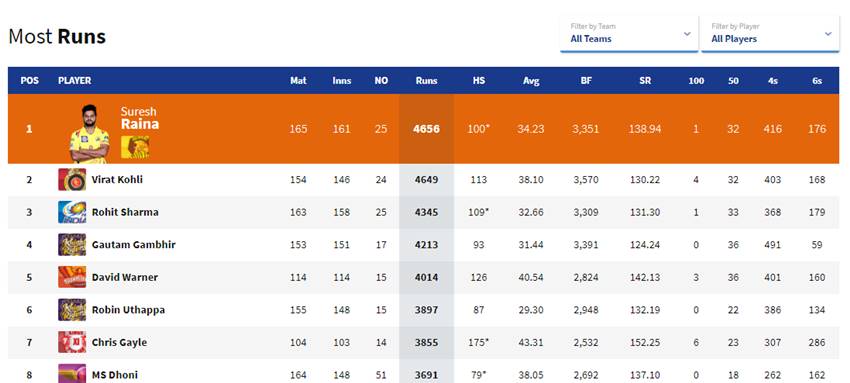 रैना के नाम इस टी-20 टूर्नामेंट में अब तक कुल 4656 रन हो गए हैं, जबकि रॉयल चैलेंजर्स बेंगलुरू (आरसीबी) के कप्तान विराट कोहली 4649 रनों के साथ दूसरे पायदान पर खिसक आए हैं। वहीं, इस सूची में तीसरे नंबर पर मुंबई इंडियंस (एमआई) के कप्तान रोहित शर्मा का नाम है। उनके नाम 4345 रन दर्ज हैं।