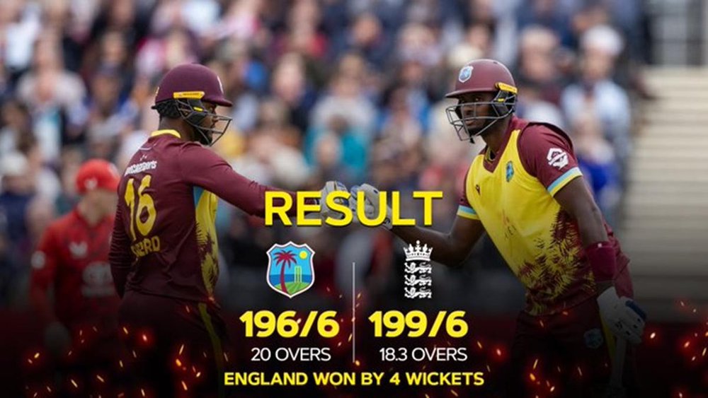 इंग्लैंड ने वेस्टइंडीज के खिलाफ दूसरे टी20 में नौ गेंद शेष रहते 197 रन का लक्ष्य सफलतापूर्वक हासिल कर लिया। जोस बटलर ने 47 रन बनाए जबकि कप्तान हैरी ब्रूक ने 34 रन बनाए। जैकब बेथेल 10 गेंदों पर तीन छक्कों की मदद से 26 और टॉम बैंटन 30 रन बनाकर नाबाद रहे।