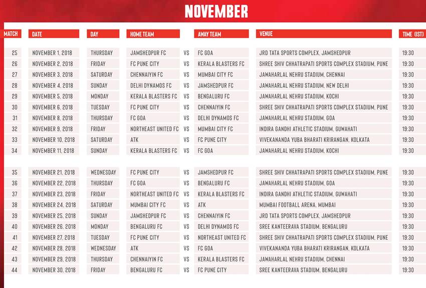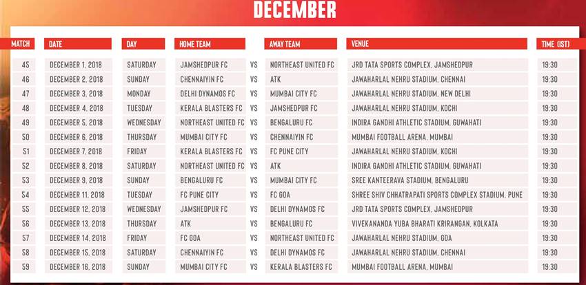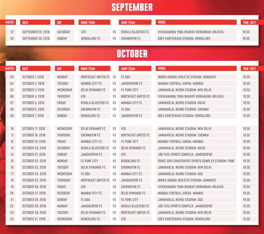ISL 2018 19 Schedule, Fixtures, Time Table, Start Date and Time, Venue, Teams: पूर्व चैंपियन एटीके और दो बार के उप विजेता केरल ब्लास्टर्स के बीच शनिवार को इंडियन सुपर लीग (आईएसएल) फुटबाल टूर्नामेंट का पहला मैच खेलेगी। आईएसएल के पांचवें सत्र में दस टीमों के बीच खिताब के लिए मुकाबला होगा। आईएसएल-पांच अब तक का सबसे लंबा सत्र होगा जो छह महीने तक चलेगा जिसमें बीच में टीमों को तीन बार विश्राम का मौका मिलेगा। इनमें से दो बार (अक्तूबर और नवंबर) फीफा तिथियों में अंतरराष्ट्रीय मैच होने तथा एक बार 2019 एएफसी एशियाई कप के लिये भारतीय टीम के अभ्यास शिविर के कारण टीमों को ब्रेक दिया जाएगा। एटीके और केरल दोनों ही पिछले सत्र में जूझते रहे।