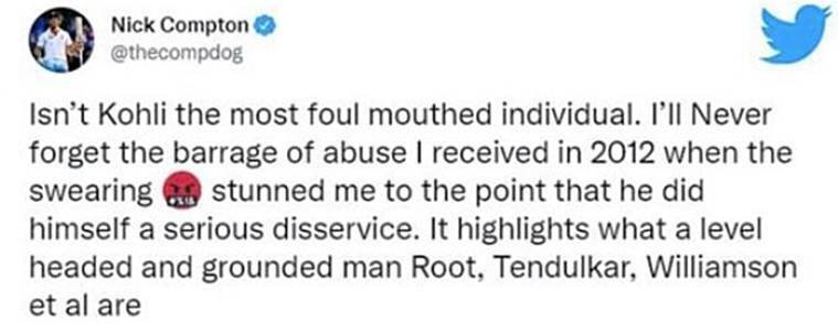 आपको बता दें 2012 से 2016 तक इंग्लैंड के लिए 16 टेस्ट मैच खेलने वाले निक कॉम्पटन ने 2012 के एक वाकिये का जिक्र करते हुए एक ट्वीट किया। उस ट्वीट में उन्होंने भारतीय कप्तान को सबसे ज्यादा अपशब्द कहने वाले वाला खिलाड़ी बताया।