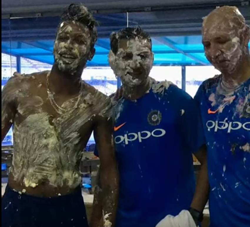इस मौके पर खिलाड़ियों ने पांड्या को जमकर केक लगाया। इसे शेयर करते हुए हार्दिक पांड्या ने अपने इंस्टाग्राम पर एक फोटो शेयर किया था जिसमें उनका पूरा शरीर केक में सना हुआ है। 2 घंटे पहले शेयर किए गए इस वीडियो पर खबर बनाने तक 295,683 लाइक्स आ चुके हैं।आपको जानकारी के लिए ये भी बता दें कि 11 अक्टूबर को टीम इंडिया के स्टार ऑलराउंडर हार्दिक पंड्या, टीम इंडिया के बैटिंग कोच संजय बांगर और टीम फिजियो पैट्रिक फारहार्ट का जन्मदिन था। लिहाजा यही वजह है कि मेज पर तीन से चार केक रखे होते हैं। तीनों के चेहरे केक से सनी हुए होते हैं।