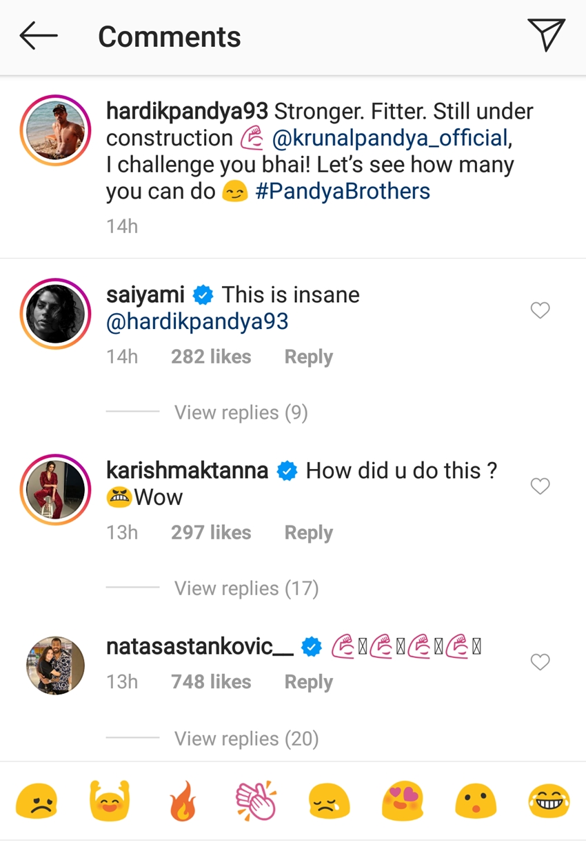 हार्दिक के इस फिटनेस वीडियो पर अब तक उनके भाई क्रुणाल का कोई रिएक्शन नहीं आया है। हालांकि, उनकी मंगेतर नताशा स्टेनकोविक का भी रिएक्शन देखने लायक है। उन्होंने कमेंट बॉक्स में ताकतवर मसल्स वाली कई इमोजी पोस्ट करते हुए हार्दिक की तारीफ की और उन्हें फिट बताया है।